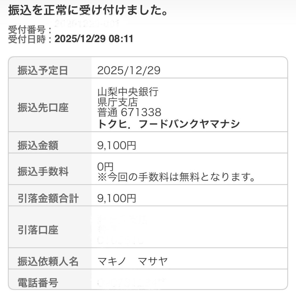 9,100円を、先ほどNPO法人フードバンク山梨様に